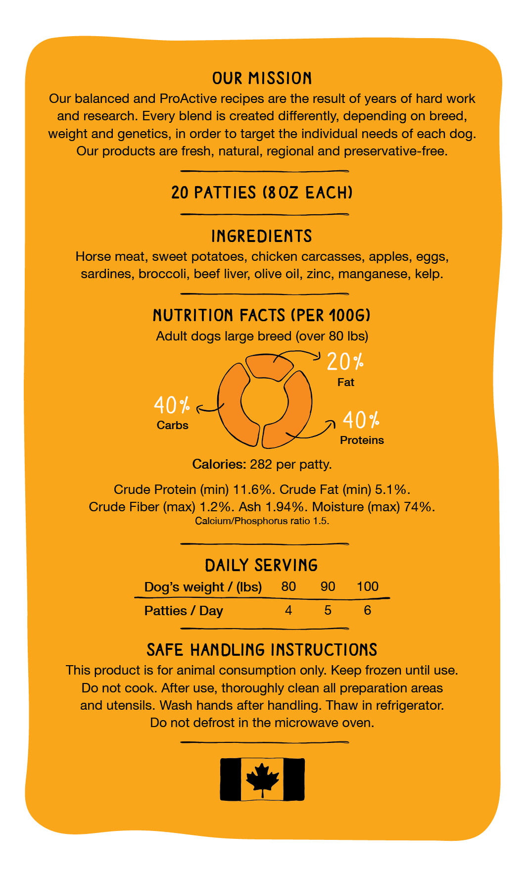 The diets provide high omega 3 content and are specifically balanced to support their high caloric needs.. Les sardines procurent non seulement une protéine de haute qualité mais aussi les acides gras (Omega 3) qui supportent le cerveau, les yeux, le cœur et la santé de la peau en prévention des cellules cancéreuses. Les Omega 3 sont anti-inflammatoires, ce qui est recherché pour la santé de la peau. Le lycopène, présent dans la sauce tomate, est reconnu comme une composante qui combat certains cancers spécifiquement. L’huile d’olive et les patates douces en plus grande quantité, viennent fournir les besoins caloriques de ces très grandes races. Ingredients: Sweet potatoes, Chicken breast, chicken carcasses, beef heart, eggs, broccoli, sardines, beef liver, zinc, manganese, biological kelp.