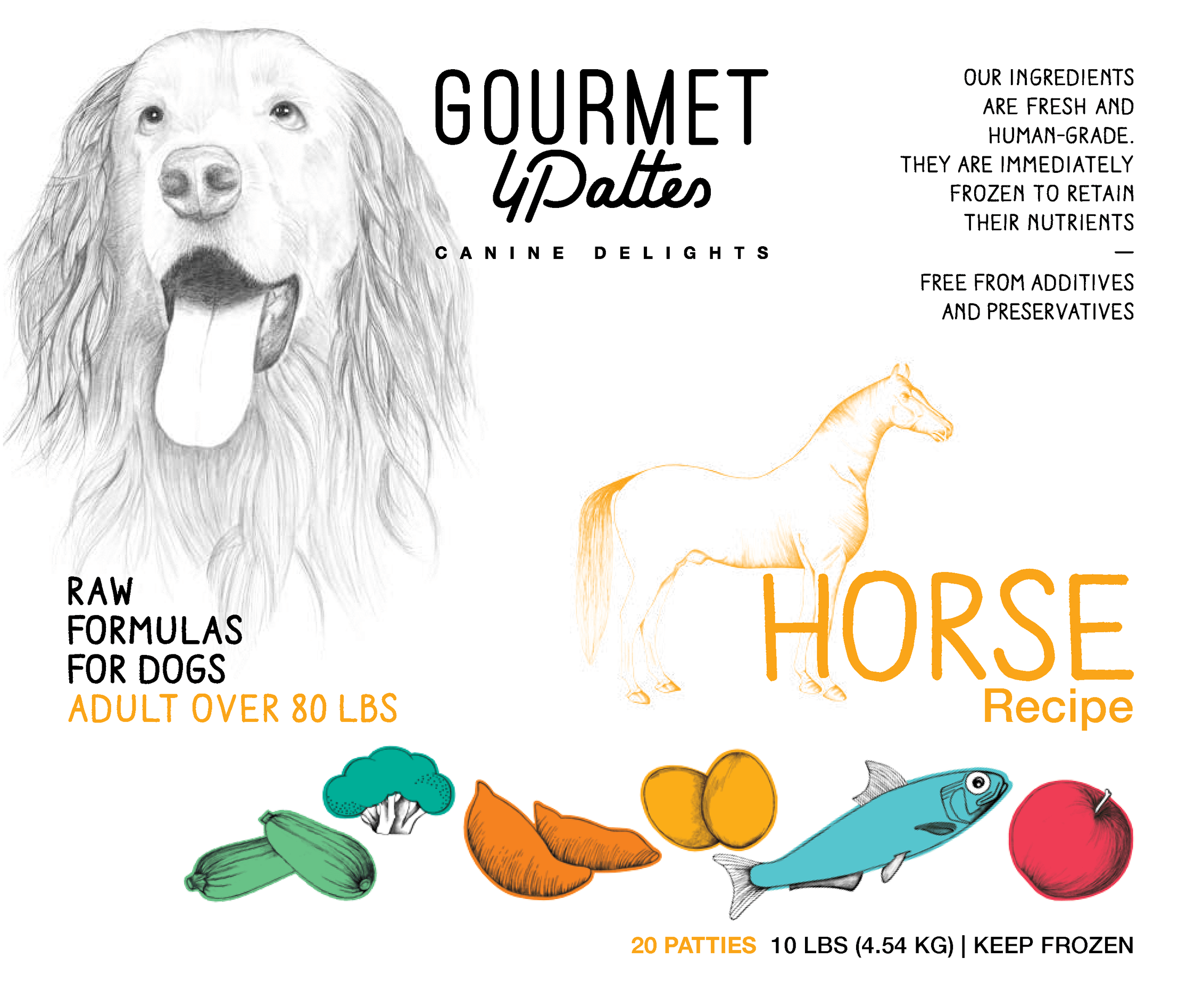 The diets provide high omega 3 content and are specifically balanced to support their high caloric needs.. Les sardines procurent non seulement une protéine de haute qualité mais aussi les acides gras (Omega 3) qui supportent le cerveau, les yeux, le cœur et la santé de la peau en prévention des cellules cancéreuses. Les Omega 3 sont anti-inflammatoires, ce qui est recherché pour la santé de la peau. Le lycopène, présent dans la sauce tomate, est reconnu comme une composante qui combat certains cancers spécifiquement. L’huile d’olive et les patates douces en plus grande quantité, viennent fournir les besoins caloriques de ces très grandes races. Ingredients: sweet potatoes, beef, chicken carcasses,, beef heart, broccoli, sardines, eggs, beef liver, zinc, manganese, biological kelp